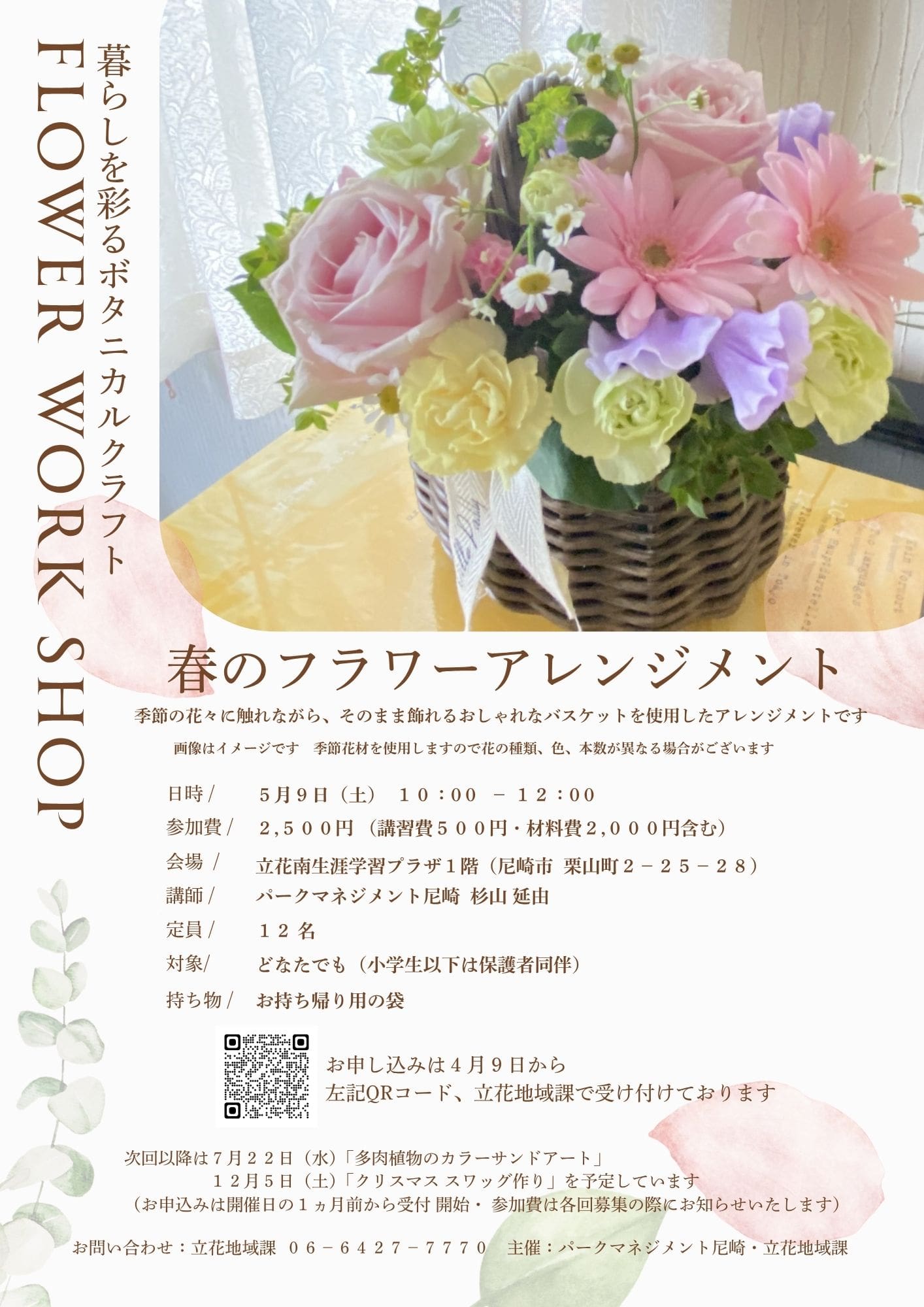 暮らしを彩るボタニカルクラフトは立花南生涯学習プラザ(立花地域課)とパークマネジメント尼崎の共催企画。 地域の子供から大人まで楽しめる植物を使ったワークショップを開催します。 \春のフラワーアレンジメント/ 季節の花々に...