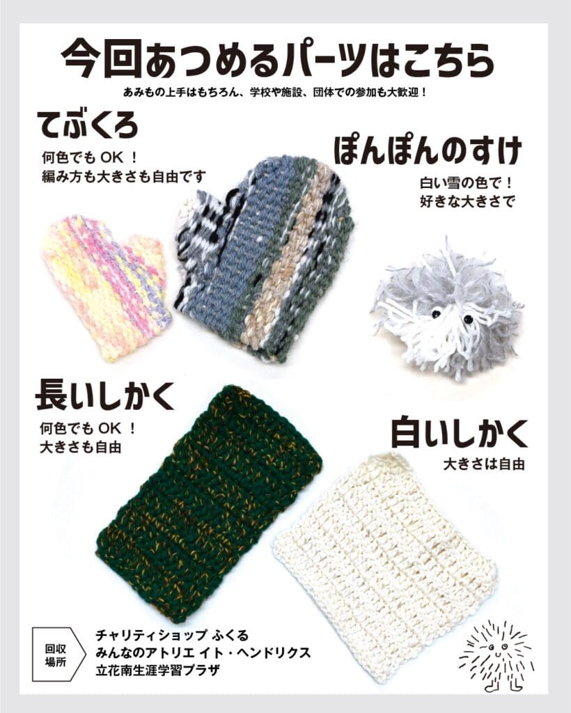 amuamu2025 作品テーマ「てぶくろ」のパーツを編んだり、繋いだりする「アムデイ」を立花南生涯学習プラザで開催します。どなたでも参加できます。