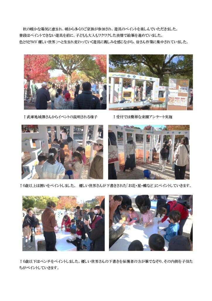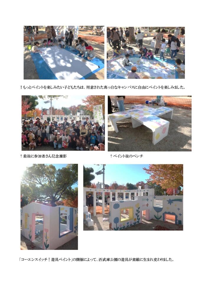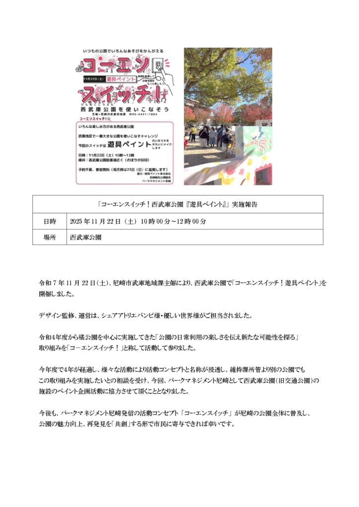 ホームイベント情報コーエンスイッチ!西武庫公園「遊具ペイント」実施報告 コーエンスイッチ!西武庫公園「遊具ペイント」実施報告 コーエンスイッチ!活動報告 2025年11月22日(土)、10時~12時 西武庫公園で開催しました。 ◇主催:尼崎市武庫地域課 ◇協力:関西ペイント株式会社、尼崎緑化公園協会、パークマネジメント尼崎 前の記事 一覧に戻る 次の記事