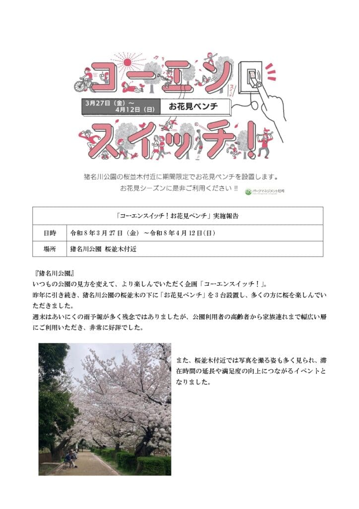 ホームイベント情報「コーエンスイッチ!お花見ベンチ」 活動報告🌸 「コーエンスイッチ!お花見ベンチ」 活動報告🌸 コーエンスイッチ!活動報告 令和8年3月27日~4月12日までの期間、猪名川公園の桜並木の下に「お花見ベンチ」を3台設置し、多くの来園者に桜を楽しんでいただきました。 前の記事 一覧に戻る 次の記事