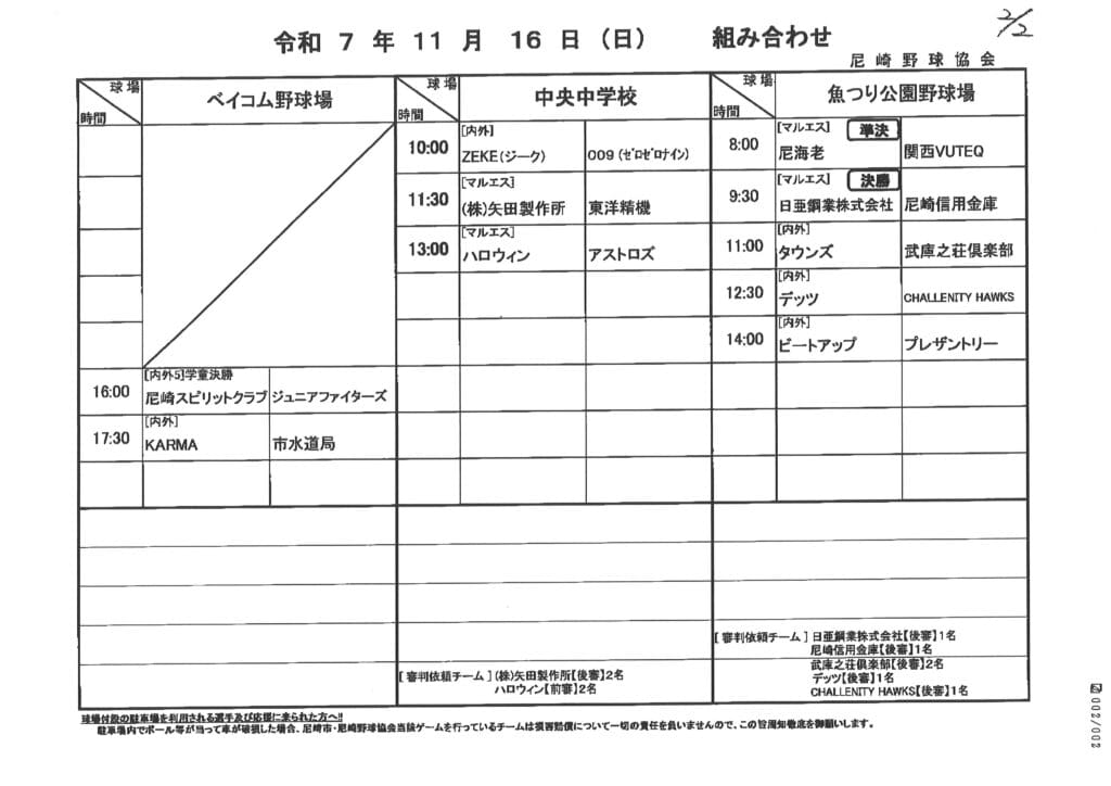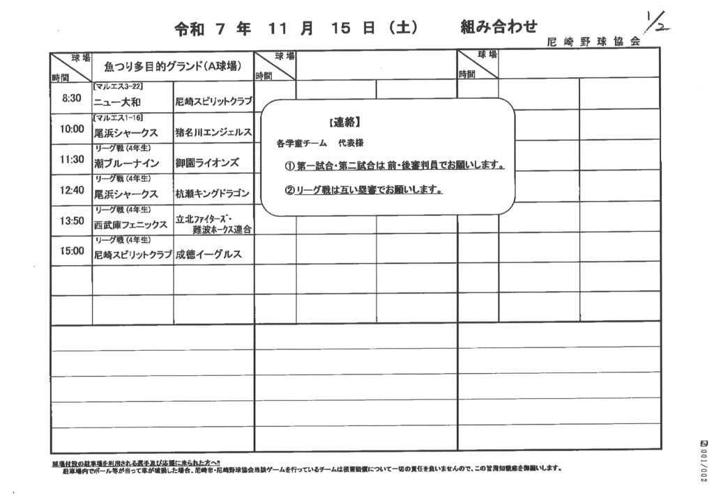 ホームお知らせ11月15日、16日 野球組み合わせ 2025年11月10日更新 11月15日、16日 野球組み合わせ 野球組合せ PDFはこちらからダウンロードできます。 前の記事 一覧に戻る 次の記事