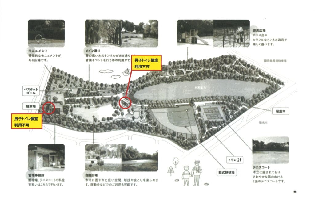 猪名川公園では、漏水により下記2ヶ所のトイレのご利用ができません。